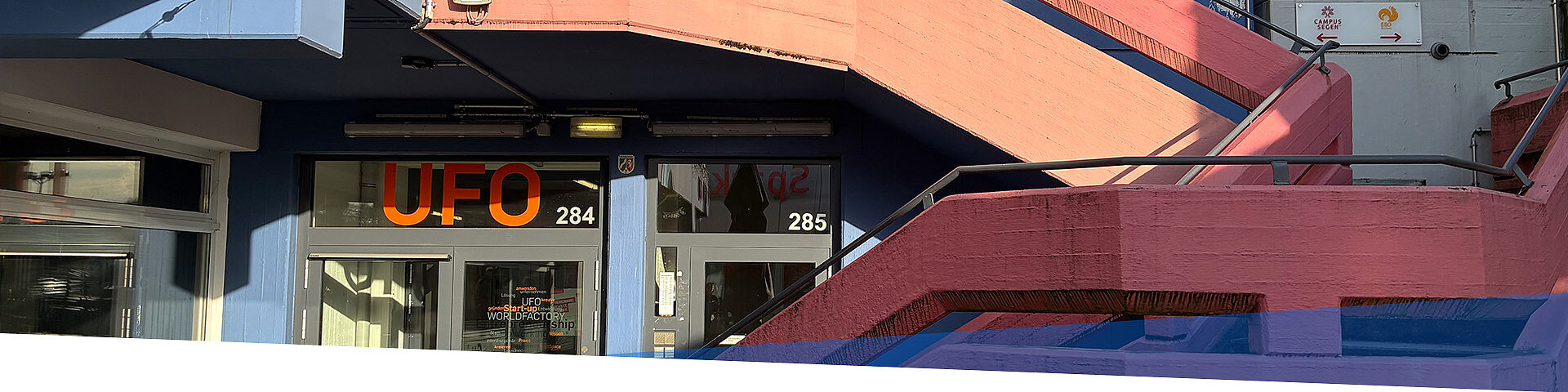 Verlassen Sie die Haltestelle in Richtung Unicenter und gehen Sie nach links. Unmittelbar hinter der Brücke befindet sich auf der rechten Seite das Uniforum (Universitätsforum Ost/UFO).