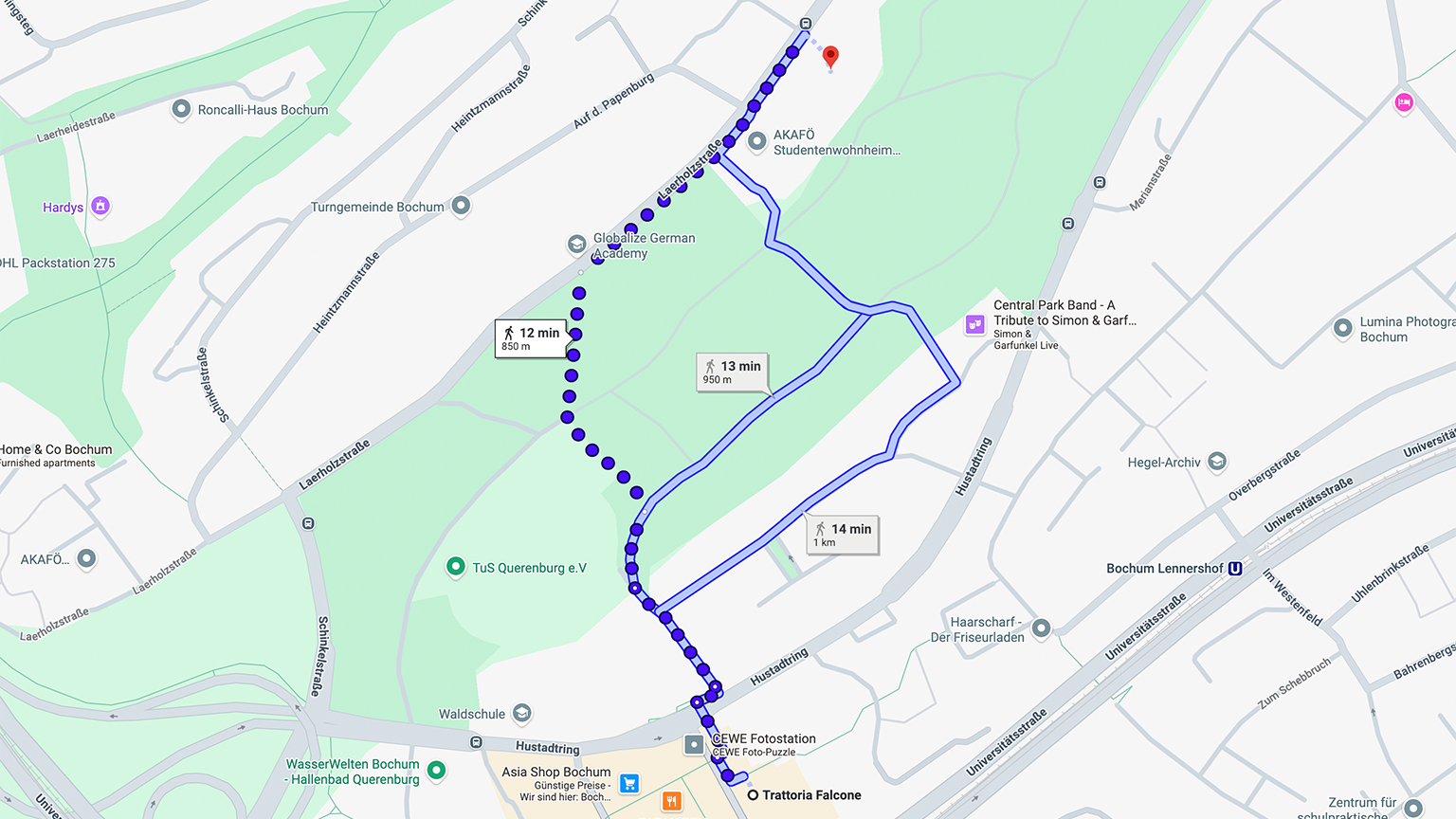 - Nehmen Sie ab Bochum Hauptbahnhof die Buslinie 356 in Richtung Bochum Ruhr-Universität bis zur Haltestelle Auf der Papenburg. Das Gästehaus befindet sich direkt gegenüber der Bushaltestelle.